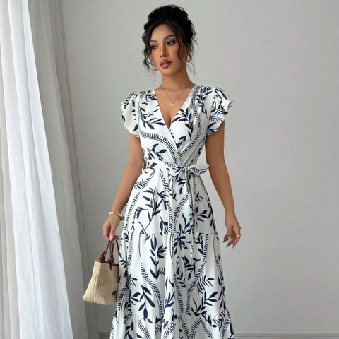 Abito da donna con stampa floreale a trapezio da festa in spiaggia con motivo a righe a righe manica corta