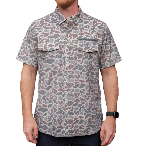 Camicie da pesca a manica corta con stampa mimetica personalizzata SPF in tessuto leggero da uomo con bottoni e camicie da pesca