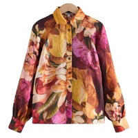 חולצת סאטן משי בהדפס פרחוני יוקרתי בהתאמה אישית, חולצה נשית עם כפתורים, שרוולים ארוכים, סגנון קז'ואל, אופנה מהירה